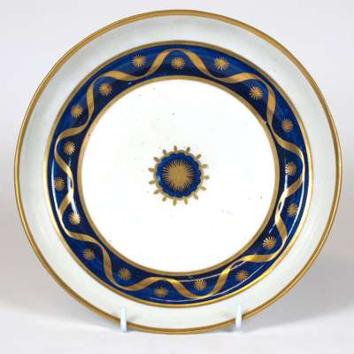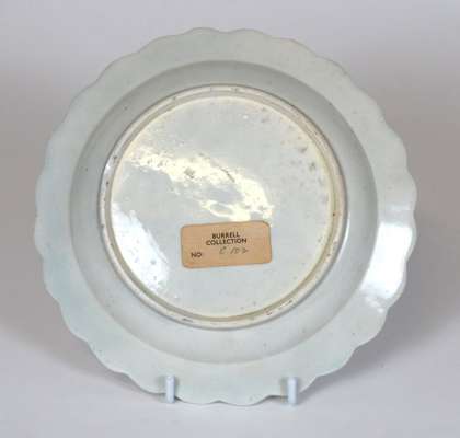 of shaped circular form, decorated with floral sprays, Burrell Collection label 'No. C102', 18cm wide; and a Worcester plate of circular form with blue and gilt decoration, blue crescent mark, 22cm wide (2)