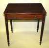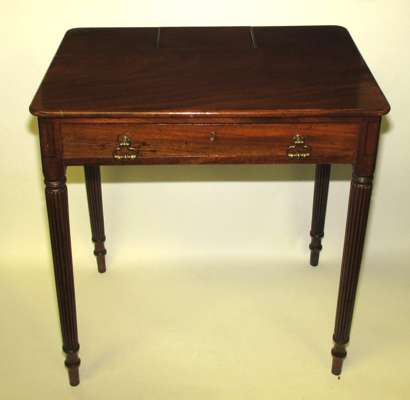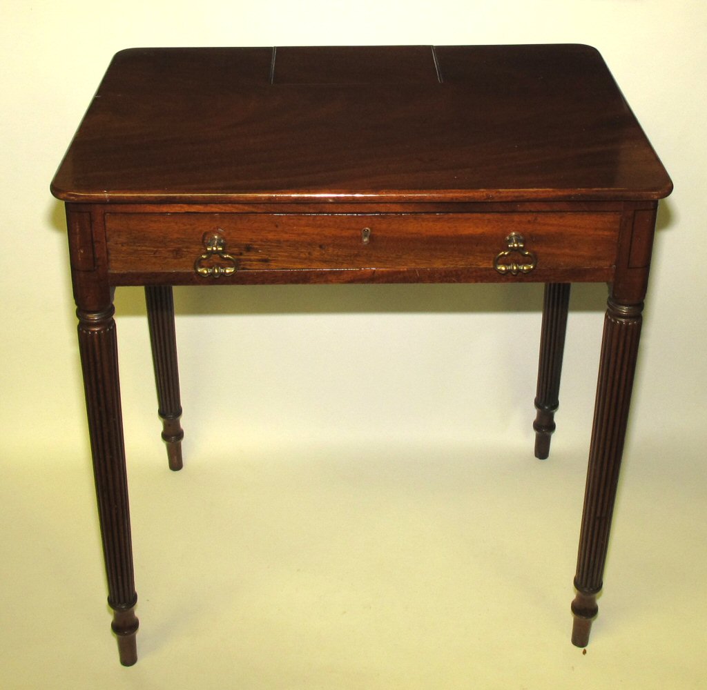 the rounded rectangular top with a hinged flap revealing a recess fitted for inkpots and pens, over a single frieze drawer, raised on reeded and turned tapered legs