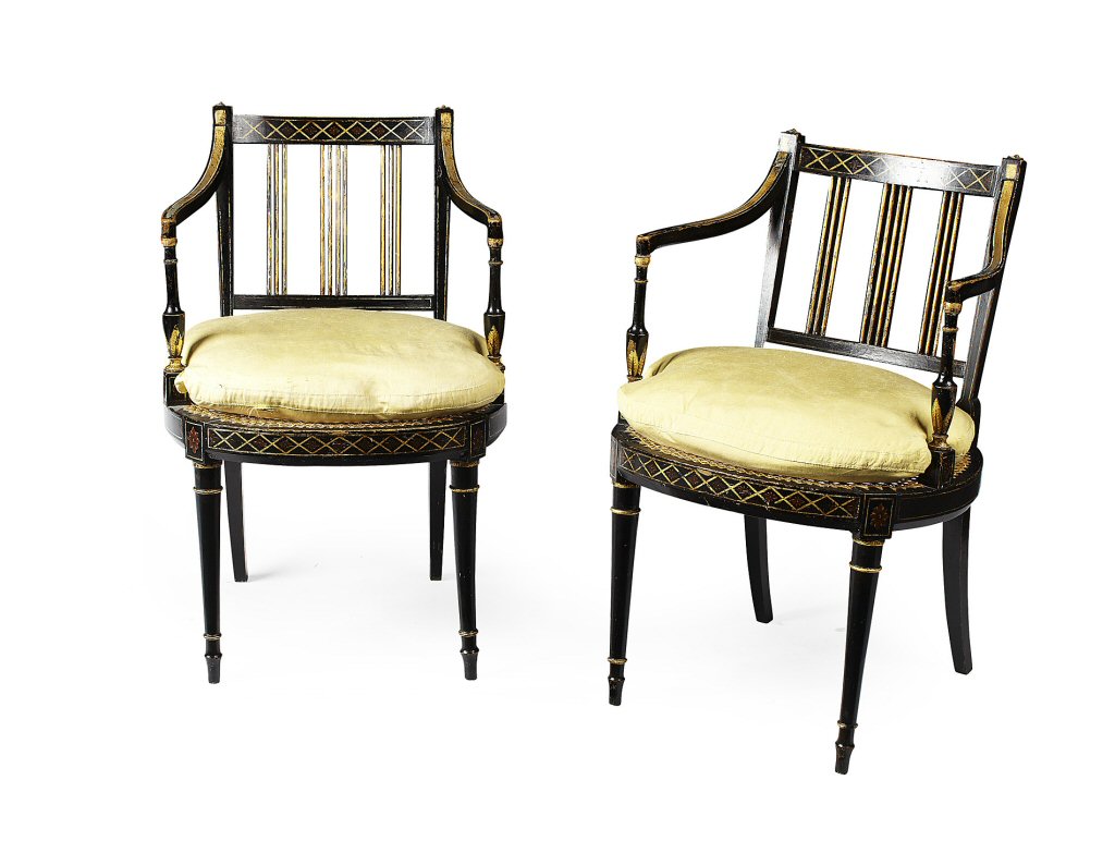 PAIR OF REGENCY EBONISED AND PARCEL GILT CANED ARMCHAIRS