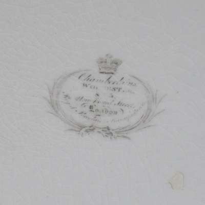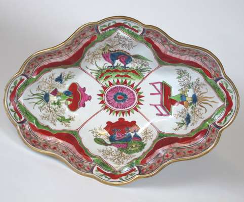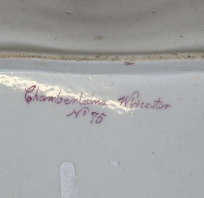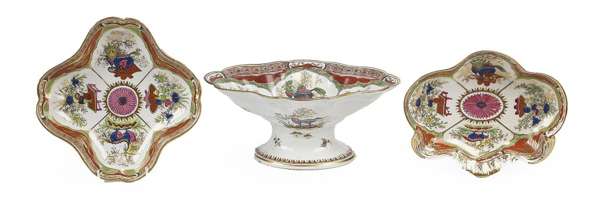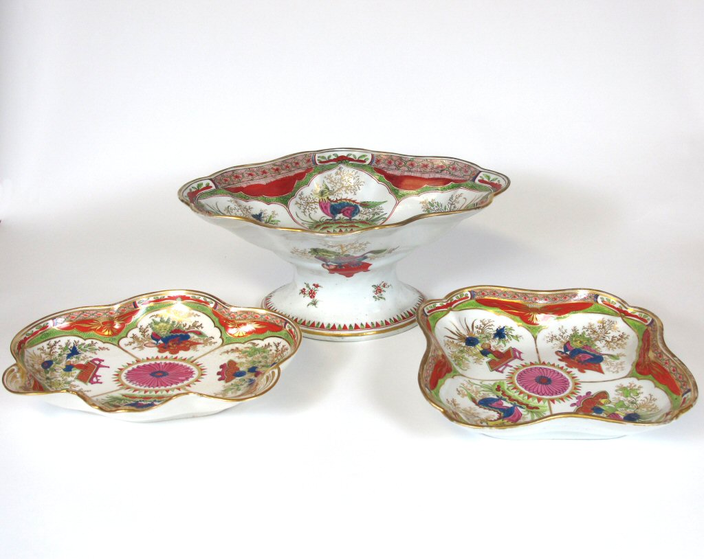 of shaped oval form, 30.5cm wide, 13cm high; a similar pattern dish of shaped square form, mark 'Chamberlain's Worcester, No. 75', 21cm wide; and another dish of oval shaped form, mark 'Chamberlain's Worcester', 24.5cm wide (3)