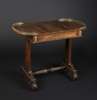the oval top with brass galleries to the D-ends, the central section sliding to reveal a recessed leather games board and reversing to a playing board, raised on carved end supports ending on carved foliate feet joined by a turned stretcher