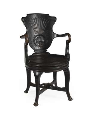 with a shell carved shaped back and scroll arms over a solid seat, raised on cabriole legs