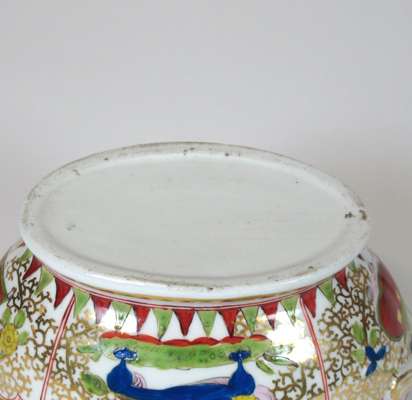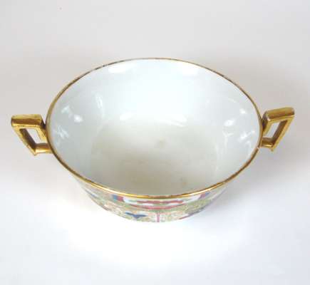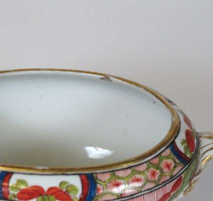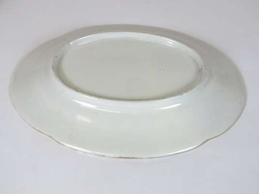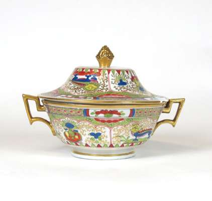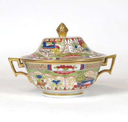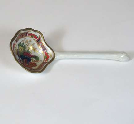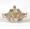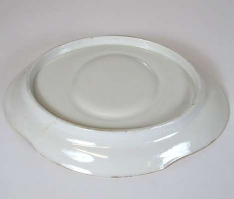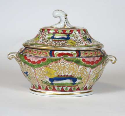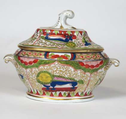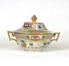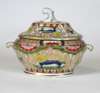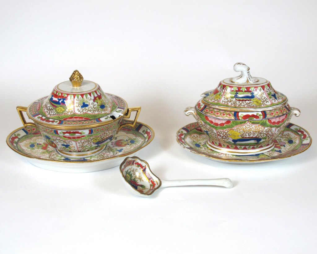 comprising a twin handled tureen, 23cm wide, 12cm high; a similar pattern underplate of shaped oval form, 23cm wide; a similar pattern twin handled tureen and cover of oval form, 13cm high; a similar pattern dish of shaped oval form, 21cm wide; and a similar pattern ladle, 16cm wide (5)