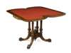 the rounded rectangular pivoting top with foliate marquetry, opening to a red baize playing surface, raised on fluted column supports leading to outswept legs with carved block feet, on porcelain castors