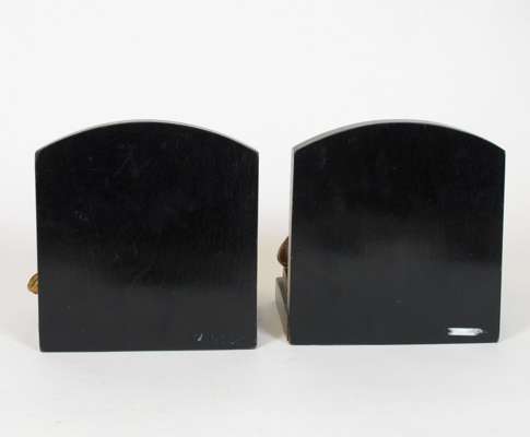 each recumbent figure on a rectangular plinth base, now mounted ebonised bookends (2)