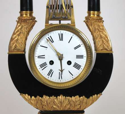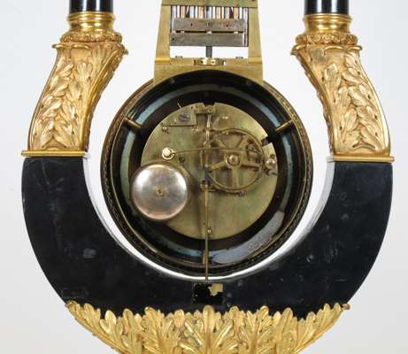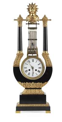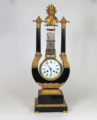 FRENCH EMPIRE EBONISED AND GILT BRONZE LYRE MANTEL CLOCK