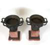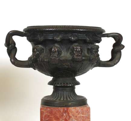 of typical form with twin naturalistic handles and cast in high relief with masks, raised on marble pedestal supports (2)