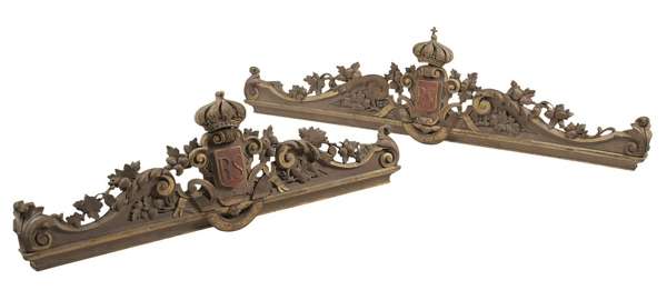 the pierced swan neck pelmets carved with foliage and scrolls, centred by a monogrammed shield inscribed 'RS', five examples surmounted by coronet cresting (7)