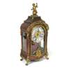 the gilt embossed dial with white enamel chapters and a gong striking eight day movement, the domed case surmounted by a cherub and raised on foliate cast toupie feet