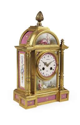 the arched top with a pinecone finial over a circular Roman numeral dial flanked by columns, the whole set with porcelain plaques depicting figures in pastoral landscapes and pink 'jeweled' panels