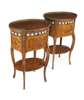 in Louis XVI style, the oval tops with a pierced brass gallery above a gilt metal band with circular porcelain mounts and two drawers, raised on cabriole legs joined by an undertier, the whole with diaper panel inlay (2)