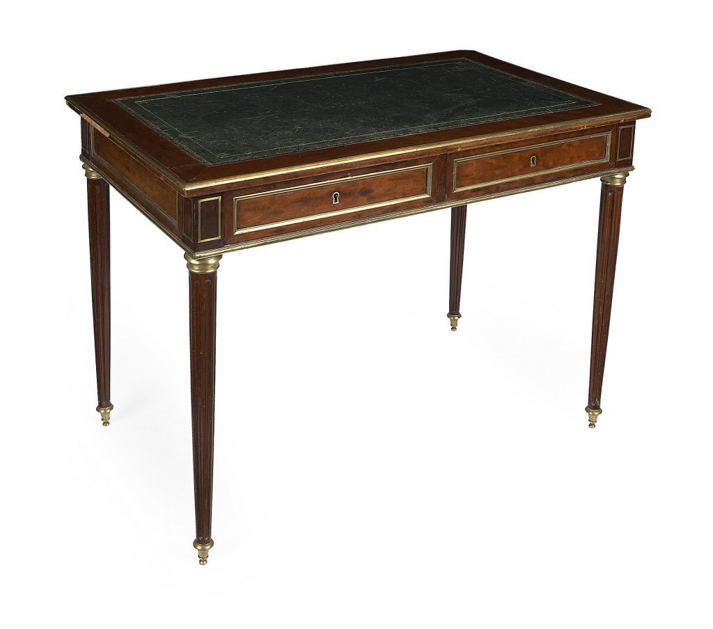 the rectangular brass bound top with a green insert leather surface over two short frieze drawers outlined in brass, raised on tapered and fluted round legs ending on toupie feet