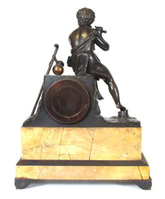 the silvered dial with a bell striking eight day movement, surmounted with a young boy playing a flute seated on a rock, the stepped marble base with applied decoration and raised on scroll feet