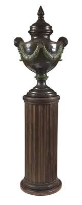with a flaming finial and twin scrolling handles, united by relief laurel wreath swags, 89cm high; together with a fluted pedestal 89cm high
