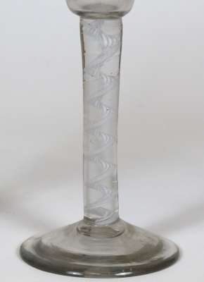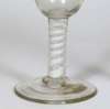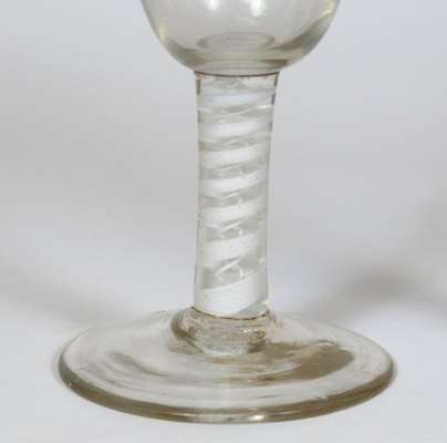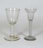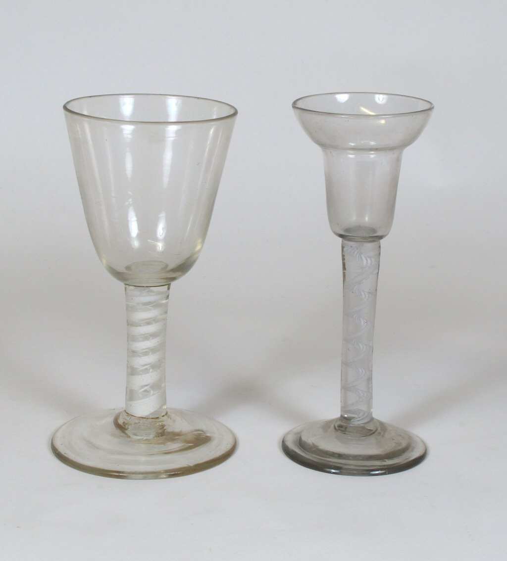 comprising a glass with funnel bowl over a plain double opaque twist stem and conical foot, 16cm high; and a glass with pan top bowl, plain opaque twist stem and domed foot, 16.5cm high (2)