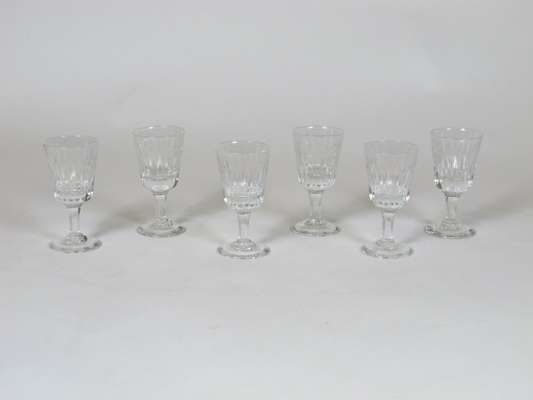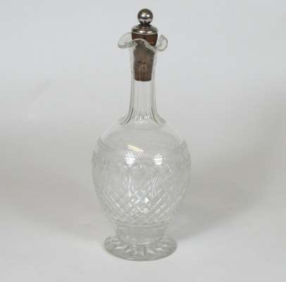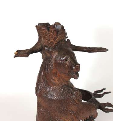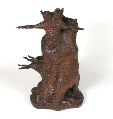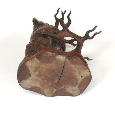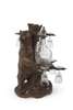 depicting a bear standing on two legs and hugging a tree, with a matched glass decanter and six glasses