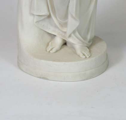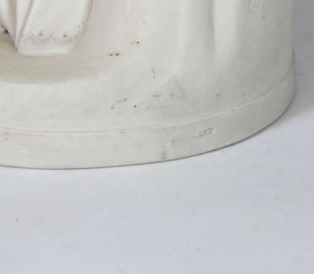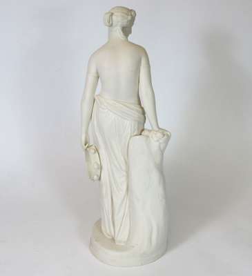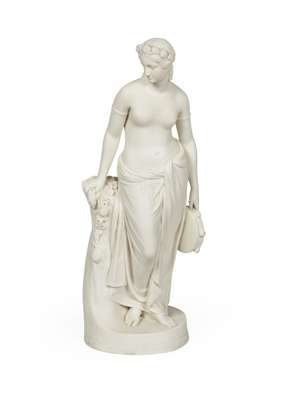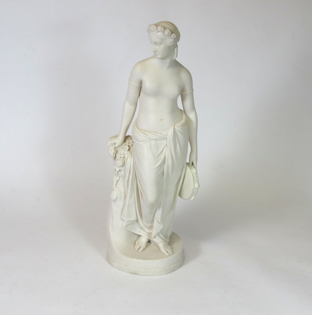 the standing figure holding a tambourine by a garland covered tree stump, shaped circular base, incised Marshall Fect Cheverton Sculp, impressed Copeland, the circular base impressed Art Union of London 1849