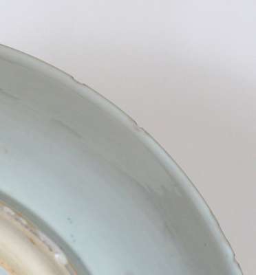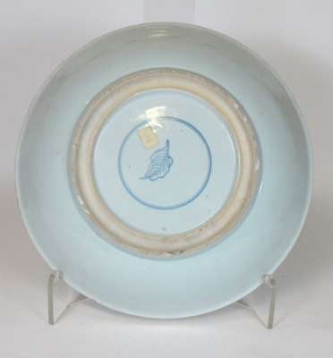 of circular form, decorated with lotus, chrysanthemum, peony and lotus blossoms, blue artemesia leaf to base