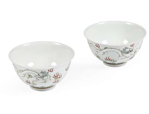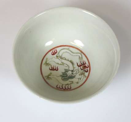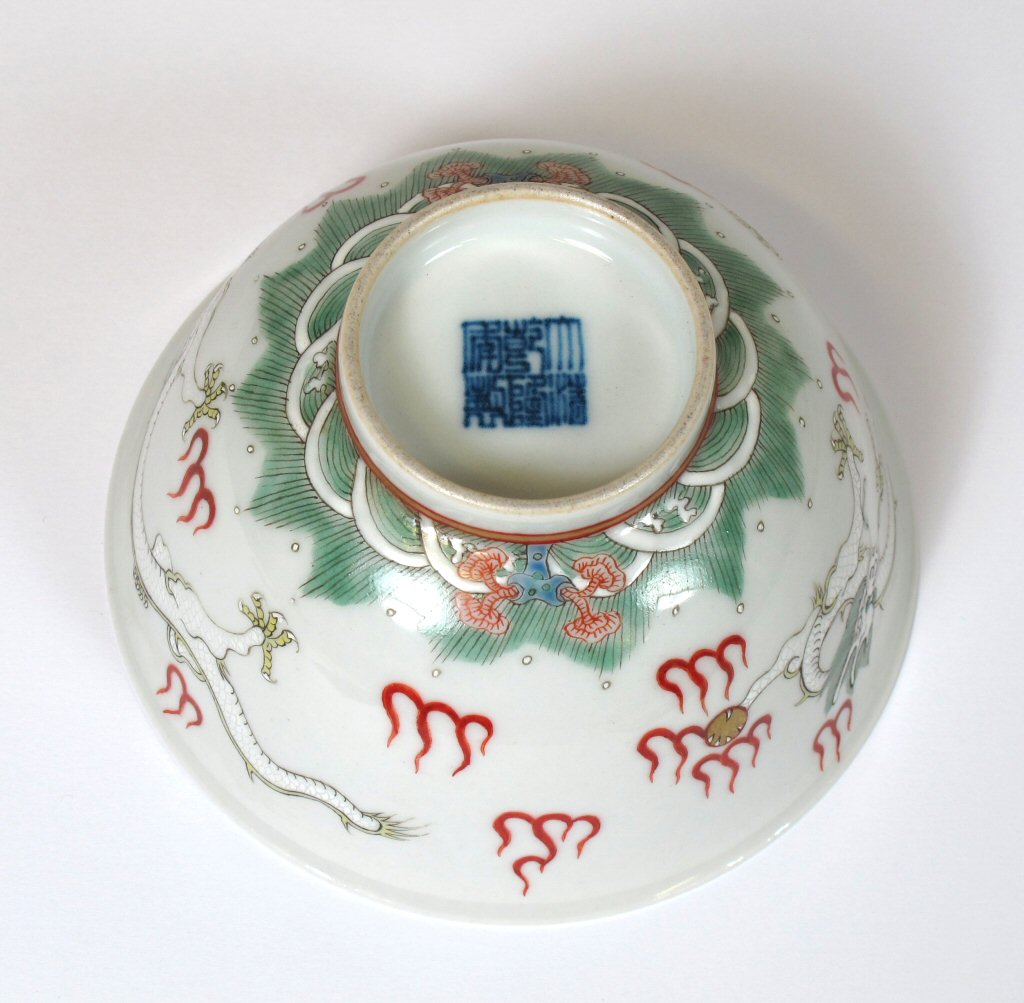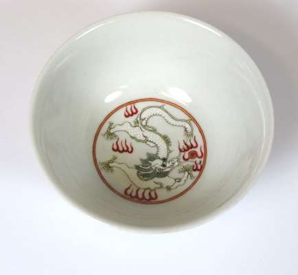 each of circular form with flared rim, the well and exterior with a white dragon chasing a flaming pearl, bears Qianlong seal mark, but later