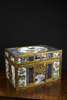 the hinged lid and sides set with porcelain panels painted with exotic birds, chrysanthemum, vases, scrolling foliage and pagodas, with side carrying handles and a void interior