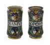 each of typical form with a slightly waisted body and curves to the rim and foot, painted in blue, yellow, ochre, purple, black and green, with portrait profile roundels above and below a label, the upper plain roundels with two heads wearing headbands in profile against half lit skies, the lower heads as Moors wearing striped shirts, pharmacy monograms above with the initials SG beneath a saltire and cross, badges on the wreath beneath, the roundels and labels are all on a green ground; the central labels inscribed 'DIAMUSCo' (Musk) and 'ISOPOHUM' (Hyssop) on the back pairs of scrolling ribbons, one in ochre the other in ochre and black (2)