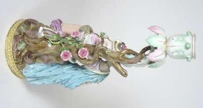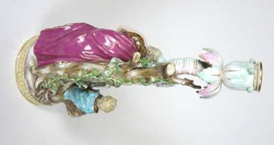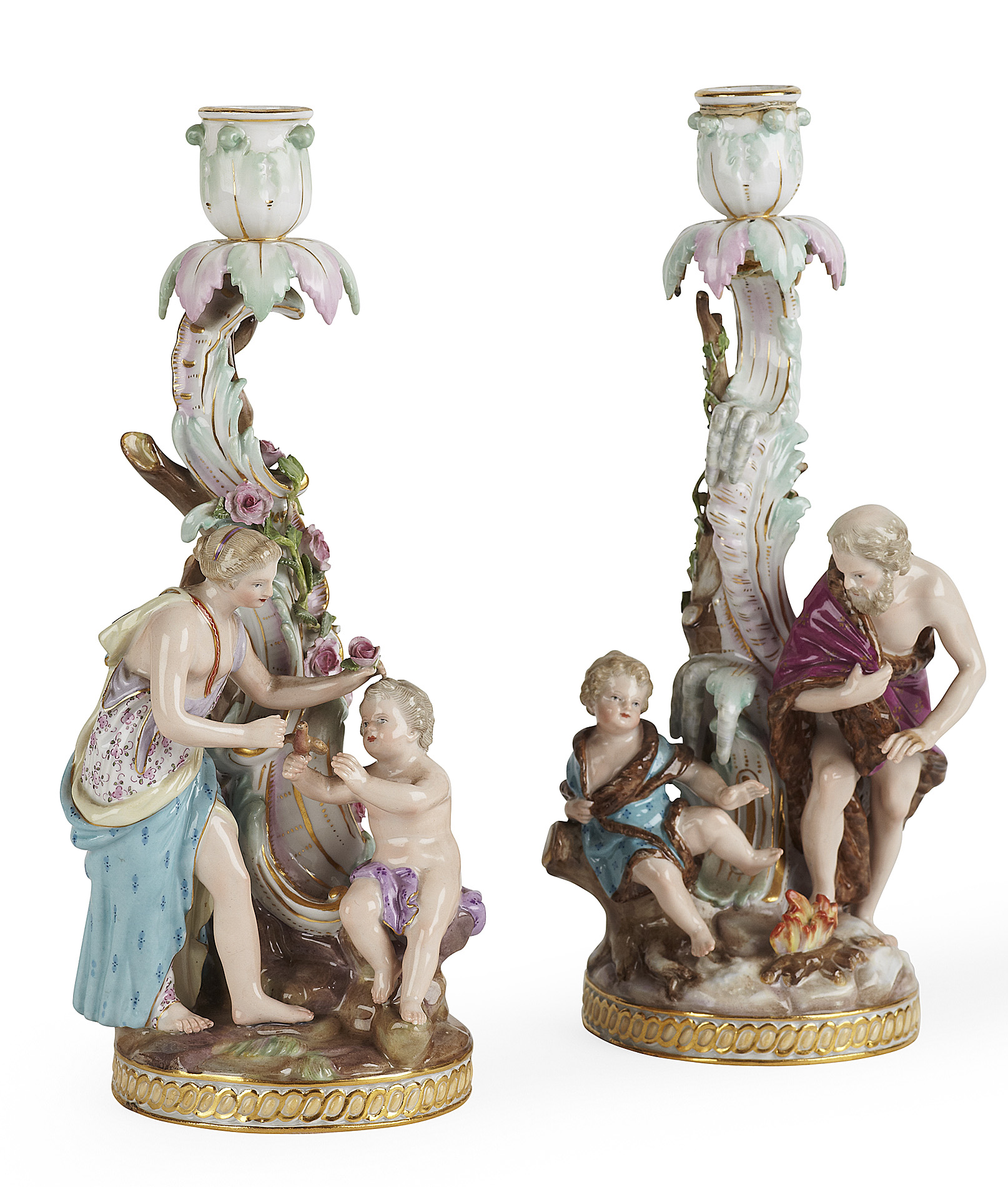 PAIR OF MEISSEN PORCELAIN CANDLESTICKS EMBLEMATIC OF SPRING AND WINTER