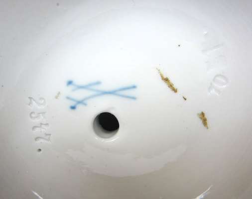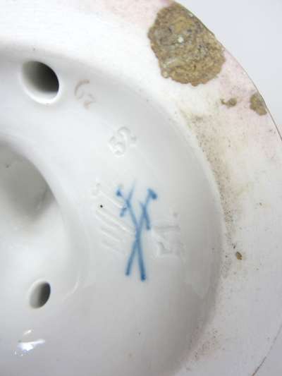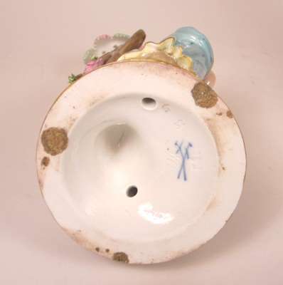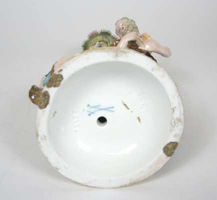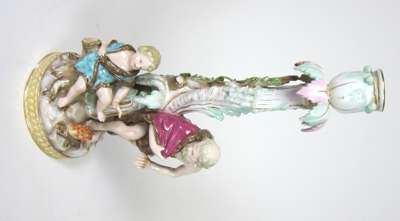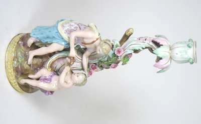 'Spring' modelled as a semi-draped maiden with a seated putto holding a bird; 'Winter' modelled as an old man wearing a fur-lined cloak with a seated putto warming themselves by a fire, blue crossed swords marks and incised 1197; together with one MEISSEN PORCELAIN THREE ARM CANDELABRUM INSERT (2)
