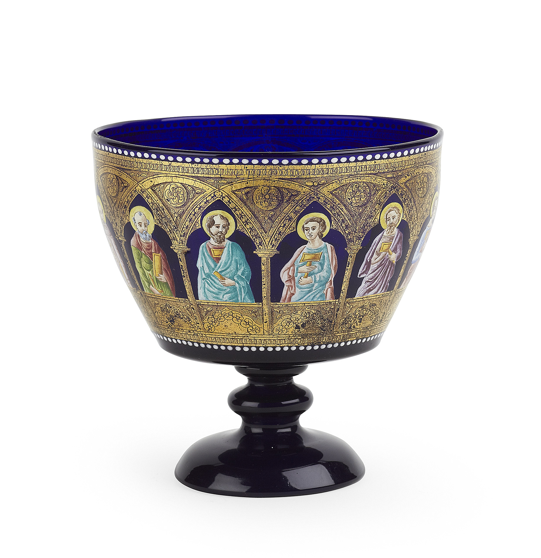 the exterior finely decorated with twelve gilt architectural niches, each containing a polychrome enamel figure of a male saint, with two bands of white 'jewel' decoration, raised on a knopped stem and domed foot