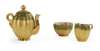 of melon form, the gilt ground bodies decorated allover with raised white enamel and gilt 'jewels' beneath a green band with gilt flower heads with purple centres, the teapot and cream jug with loop handles, the jug and sugar bowl with painted interiors, teal printed mark (3)