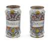 each slightly waisted with a narrow sloping band up to the rim and foot, painted in light and dark blue, yellow, ochre and green, each with an oval wreath enclosing labels with the inscription UGTO AGRIPPA (Unguentum Agrippae) on one and the inscription UGTO BASILICO (Unguentum Basilicon) on the other, all on a dark ochre ground with three large birds and foliated leaves above the inscription, a sun with rays below within a roundel, with roundels with yellow grounds above and below on the enclosing wreath each with the monogram SN below and F above beneath a single cross, the wreath edged with two ribbon lines in turquoise, the base of the jar inscribed UGTO BASILICO with incised letters and numbers, probably 'orgil 77' (2)