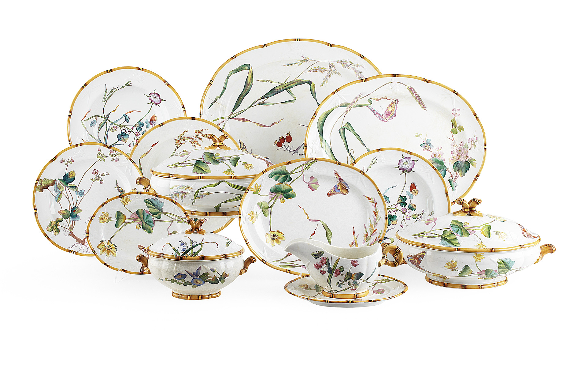 in the Japanese taste, decorated with plants and insects with a border moulded with cranes and bamboo with a faux bamboo rim, comprising: thirty four dinner plates, 26.5cm diam; sixteen luncheon plates, 23.5cm diam; seventeen side plates, 21cm diam; eighteen soup bowls, 27cm diam; eighteen dessert bowls, 23.5cm diam; a pair of sauce boats with underplates; a pair of sauce tureens with one underplate; seven graduated serving dishes, 28cm to 46cm long; four covered entree dishes; and a footed bowl (qty)