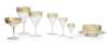 decorated with a gilt scrolling foliate band centred by masks beneath a white 'jewelled' rim, comprising: twelve water goblets, twelve red wine glasses, ten white wine glasses, ten champagne coupes, twelve sherry glasses, twelve cordial glasses, ten fingerbowls, ten underplates, and five various size decanters; together with a SET OF ELEVEN GLASS BOWLS with engraved banded decoration, and FOUR ASSOCIATED SMALL GLASS DISHES (qty)
