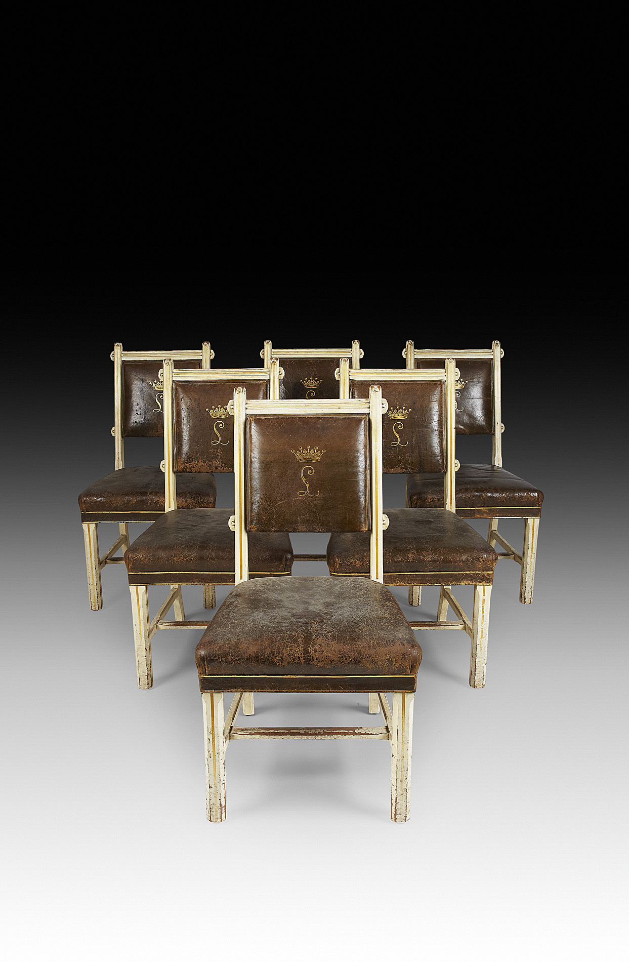 the square backs and stuffed over seats covered in green leather, bearing the Lother castle crest, raised on chamferred square legs united by an H shaped stretcher (6)