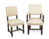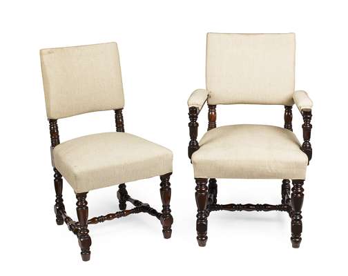 including two armchairs, covered in beige fabric, raised on turned legs united by H shaped stretchers (14)