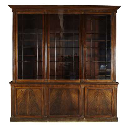 the moulded cornice above three astragal glazed panel doors enclosing adjustable shelves, the lower section with three further panelled cupboard doors raised on a plinth base