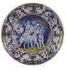 The theme of the donkey occurs on a small group of documented Deruta dishes of this period. For example, on dishes in the Victoria and Albert Museum, Louvre, National Museums of Scotland and a dish in the Willliam A. Clark collection. The images usually illustrate local pithy proverbs and sometimes have a satirical meaning. The engraved print, the source for this dish, may have been Agostino Veneziano's Procession of Silenus after a drawing by Raphael or Giulio Romano (Paris, Bibliotheque Nationale de France. Eb 7T.1) On the present dish an inserted figure uses the serving cup to pour wine over the head of Silenus, perhaps changing the meaning of the original engraving into that of a satirical commentary on the futility of drunkenness.