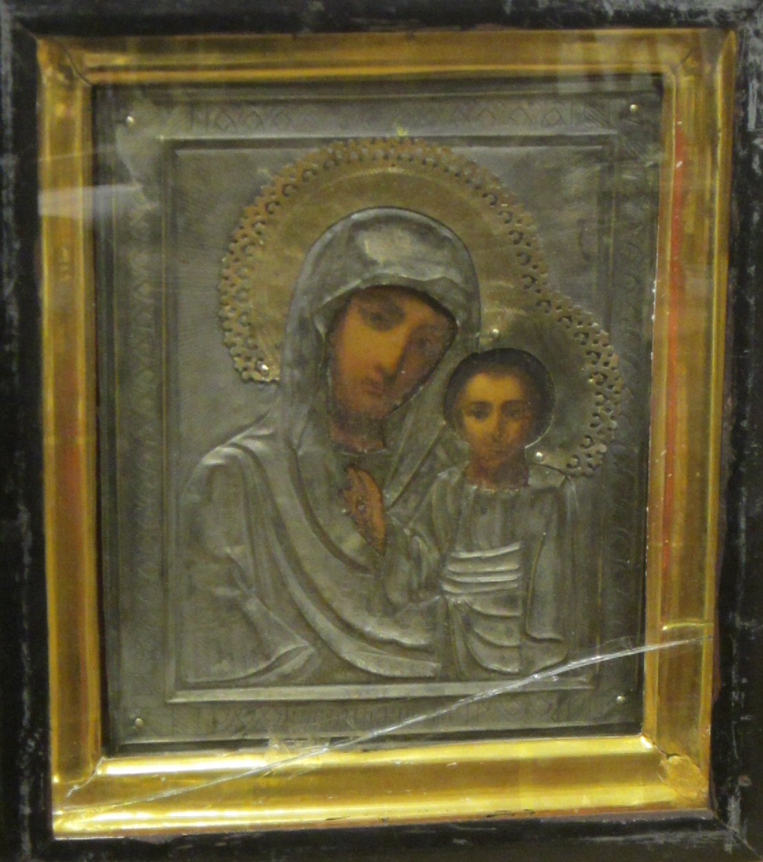 depicting Our Lady of Kazan, in a silvered metal oklad with applied gilt halo, in a boxed frame