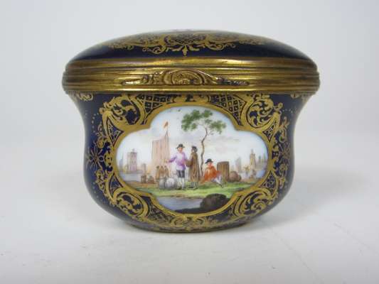 the flattened bell shape painted with harbour scenes against a cobalt blue gilt enhanced ground