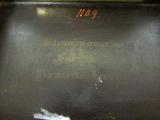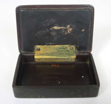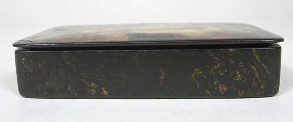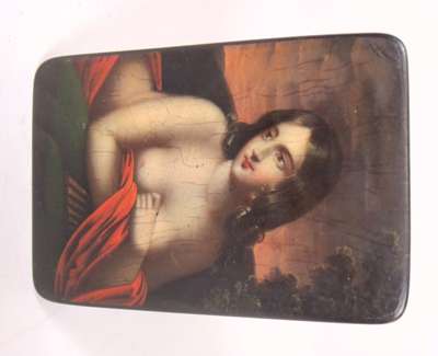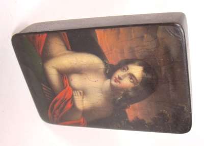 finely painted with a reclining nude draped in red silk, with marbleized sides, the interior with stamped trade label