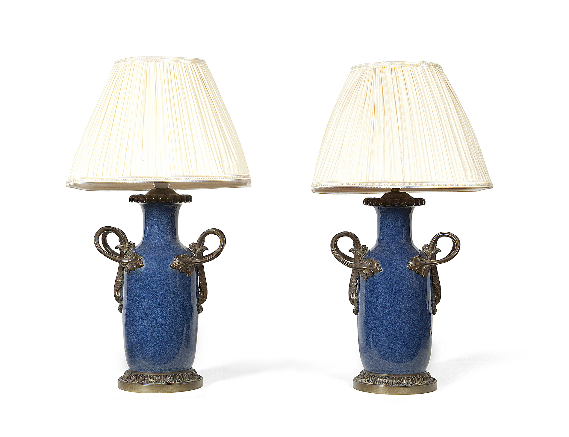 PAIR OF CHINESE POWDERED BLUE GLAZE AND GILT BRONZE MOUNTED VASES
