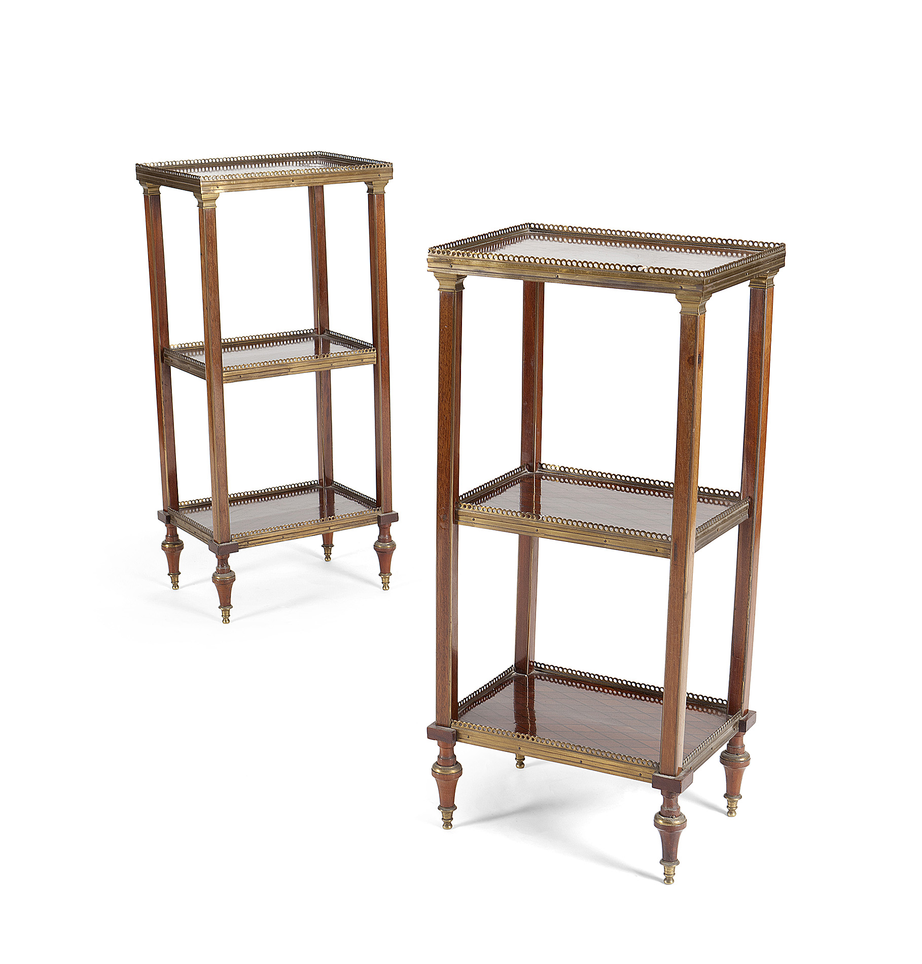 with gilt metal mounts and three rectangular galleried tiers, raised on square legs ending in toupie feet (2)