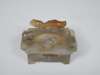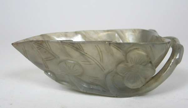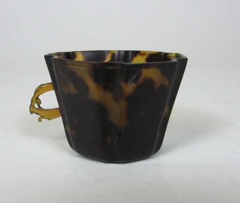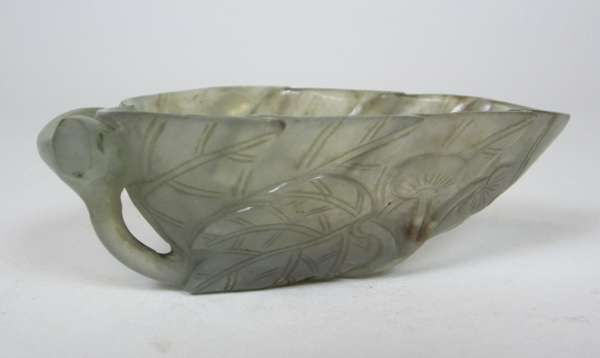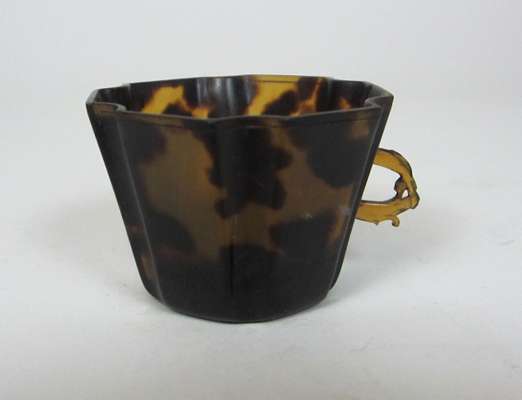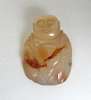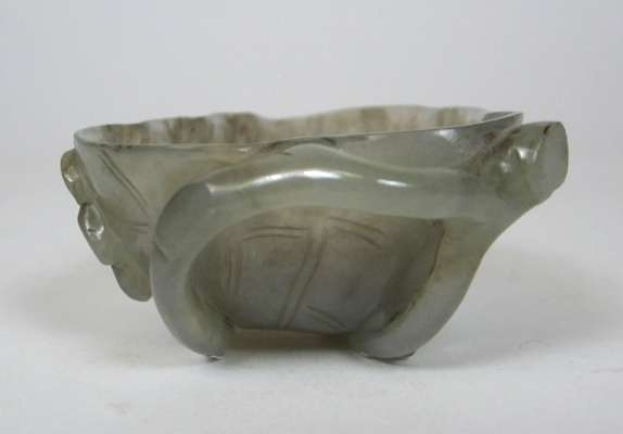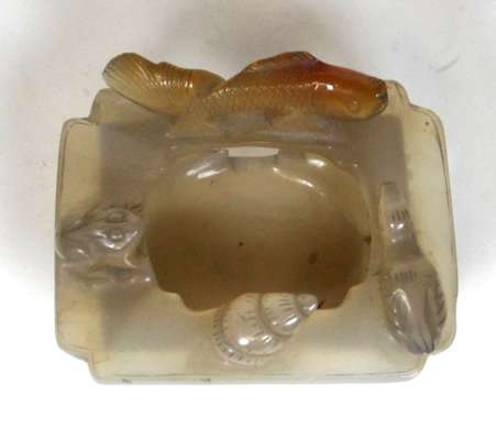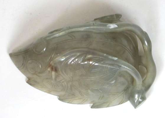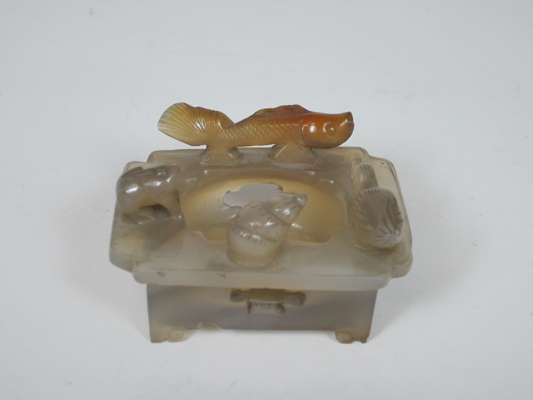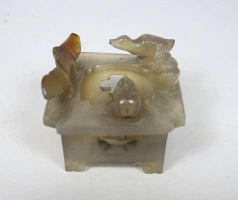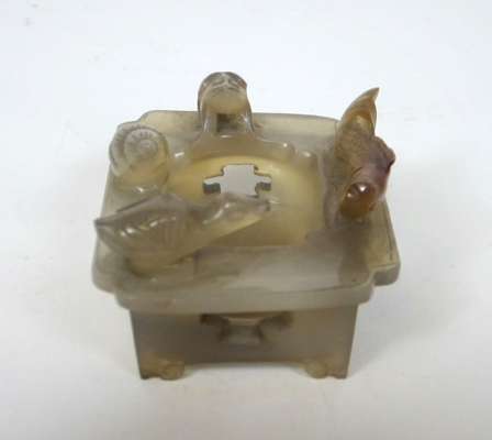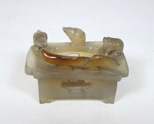 4cm high; together with a CHINESE AGATE MINATURE INCENSE BURNER with fish, 6.5cm long; a TORTOISESHELL CUP, 3.5cm high; and a CHINESE HARDSTONE LEAF SHAPED DISH, 8cm high (4)