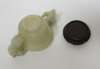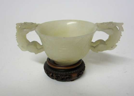 4.8cm diameter; together with a CHINESE WHITE JADE ARCHAIC DRINKING CUP, with wooden stand, 10cm long (3)