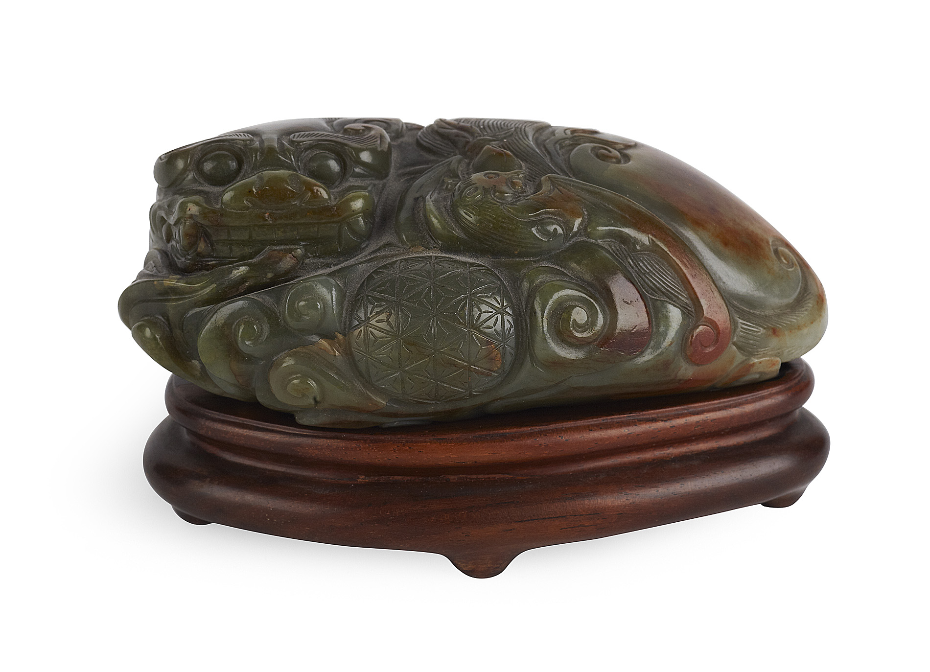 CHINESE MOTTLED BROWN AND GREEN JADE MYTHICAL ANIMAL