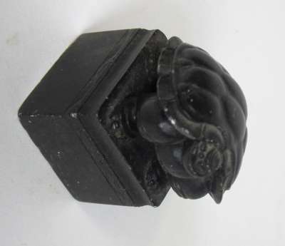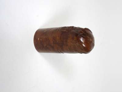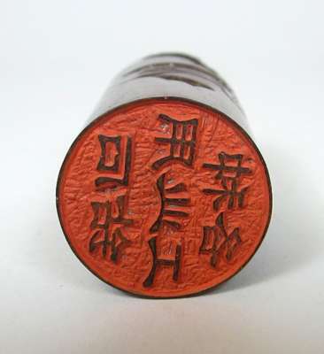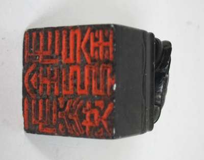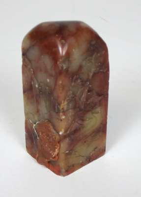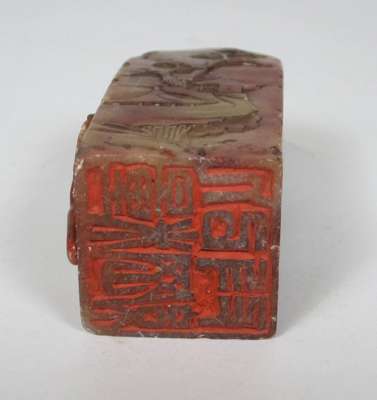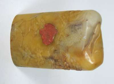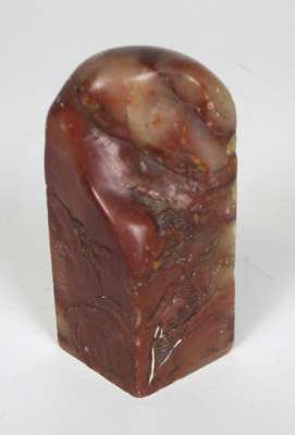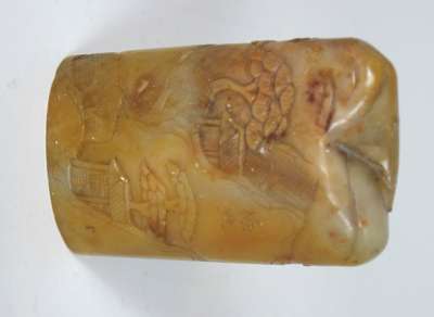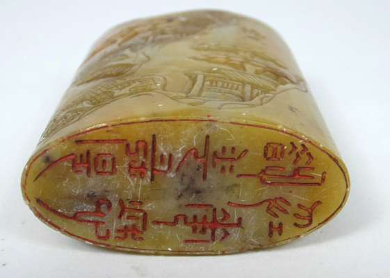 comprising a yellow jade example of oval form with an inscription depicting houses in a mountainous landscape, 8.5cm high; a round russet jade example carved with pine and prune trees, 6.7cm high; a black stone example modelled with a turtle, 4.3cm high; and a square russet jade example, modelled with mountains and pine trees, signed, 6.5cm high (4)