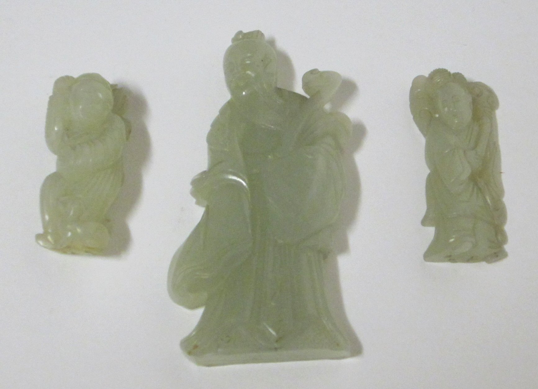 modelled clasping a ruyi sceptre, with a wooden stand, 11cm high; together with a smaller CHINESE WHITE JADE FIGURE OF A LADY modelled holding a cloud-shaped branch, 6.2cm high; and a CHINESE WHITE JADE FIGURE OF A MAN modelled carrying a lotus branch, 5.8cm high (3)