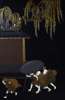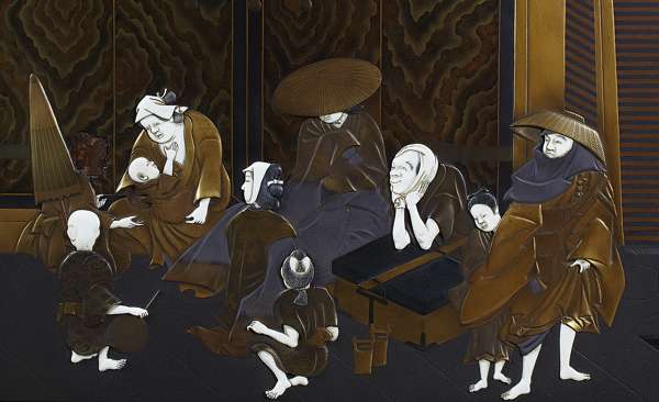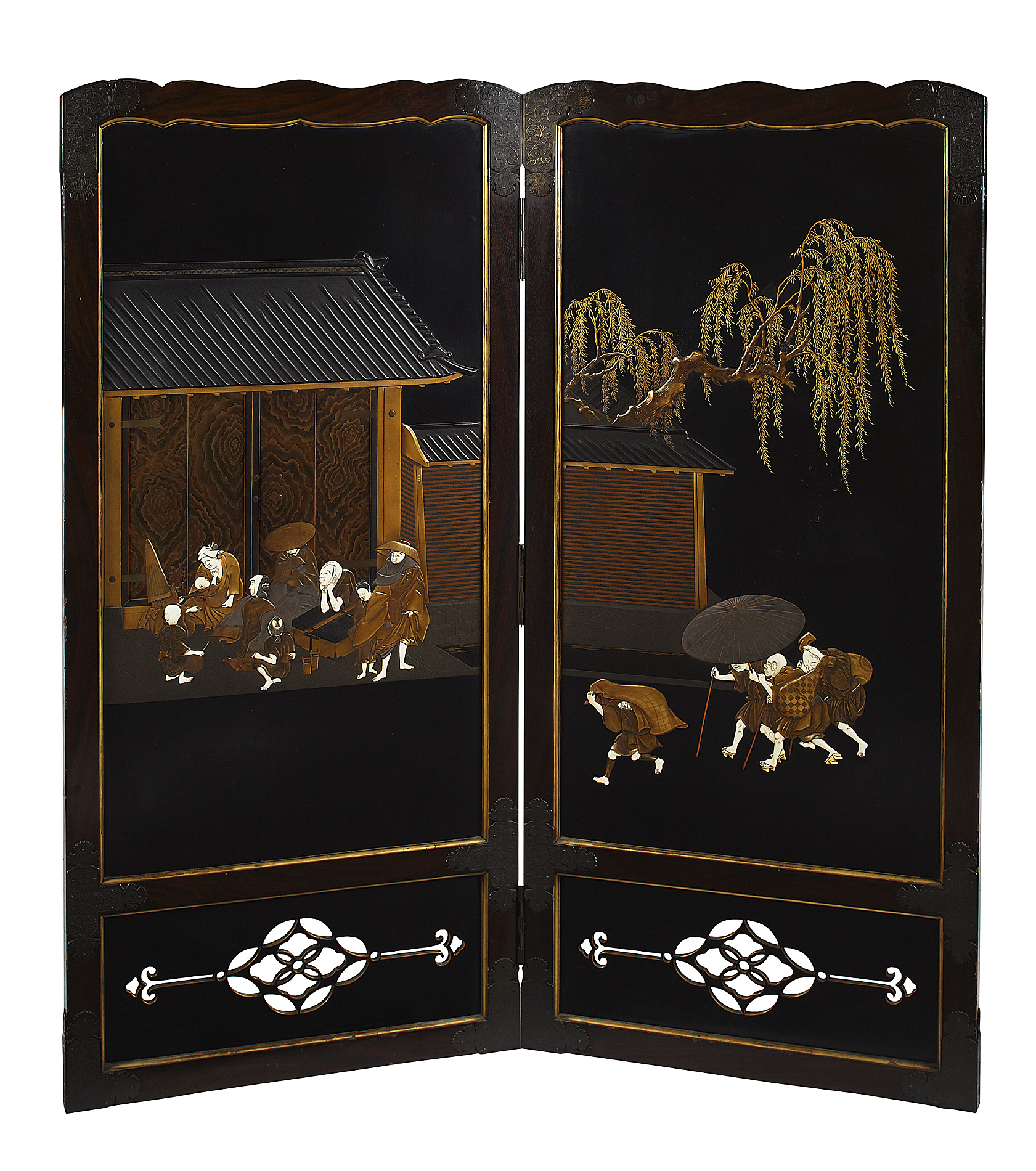 FINE JAPANESE IVORY AND LACQUER TWO FOLD SCREEN