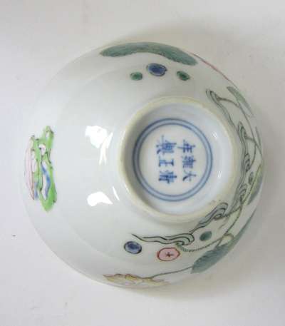 finely potted, the exterior enamelled with lotus and lingzhi, the interior with prunus blossoms, on a high foot rim, blue six character and double ring mark