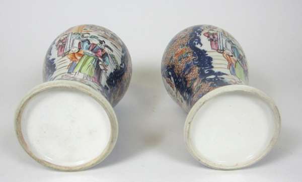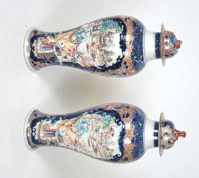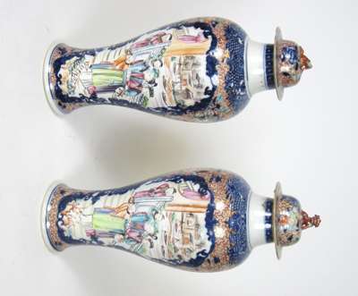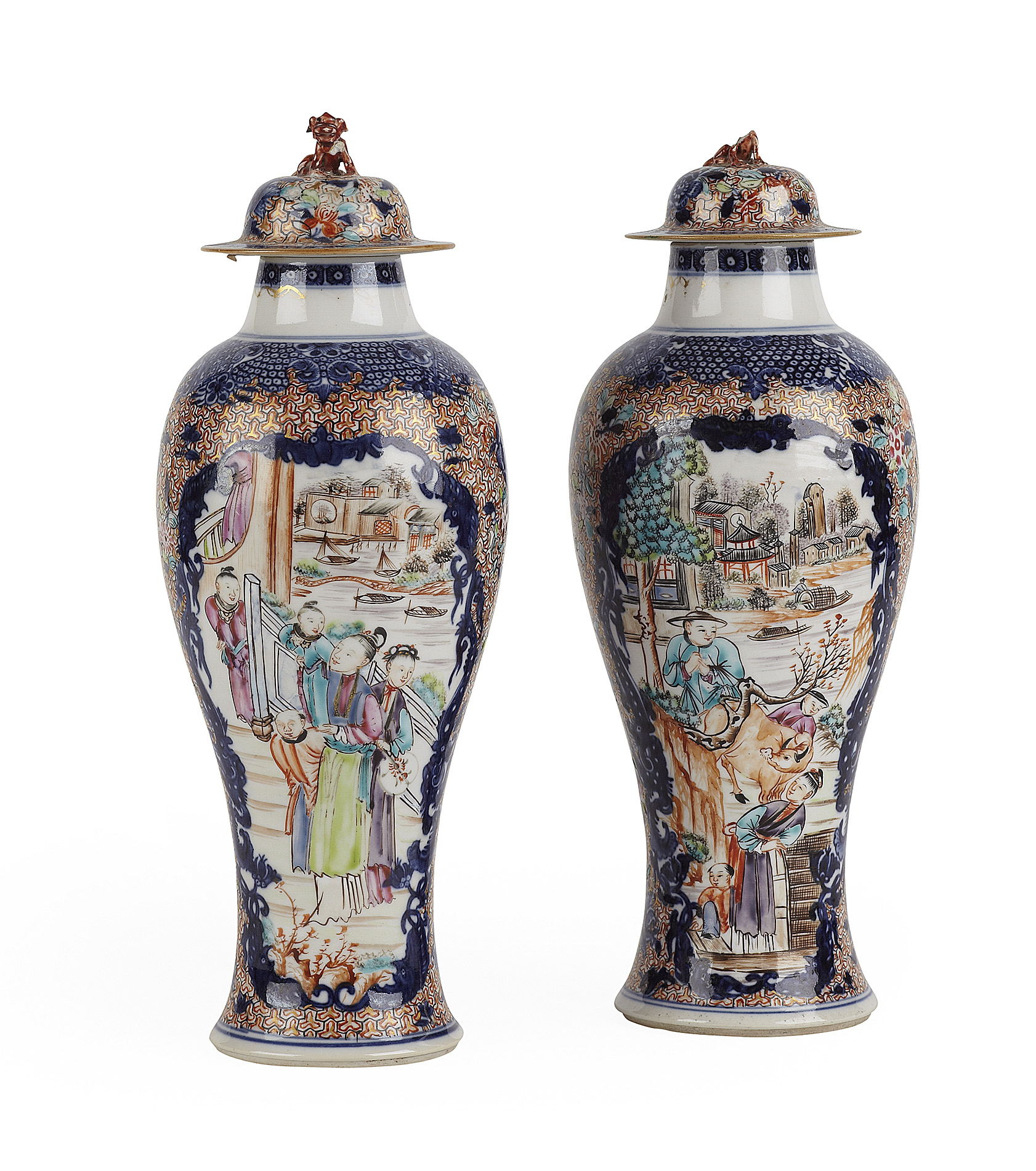 of baluster form with domed covers with fu lion finials, painted with reserves depicting women and children, the reverse with figures and a water buffalo (2)
