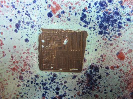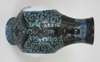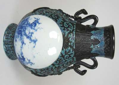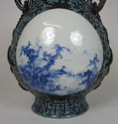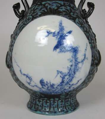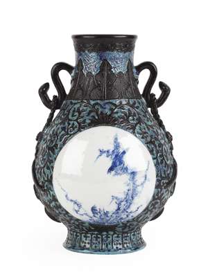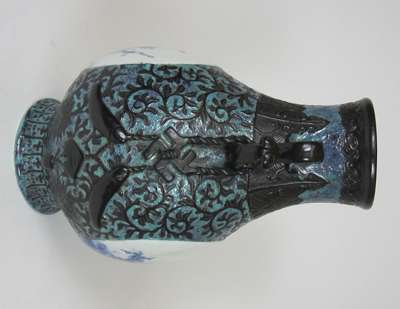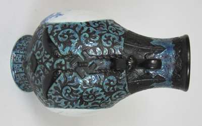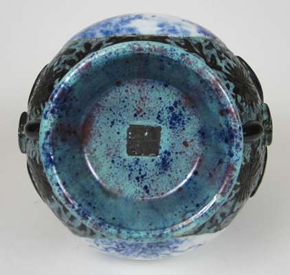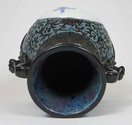moulded black glazed low relief decoration of bands of linghzi and rising leaves, the body with allover scrolling foliage on a speckled blue/purple ground, the scroll handles made to resemble bronze and 'hung' with auspicious symbols, the sides with raised circular blue and white reserves depicting songbirds and trees, Qianlong seal mark to base, but later
